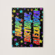 Este vibrante y divertido diseño de rompecabezas con temática de cumpleaños tiene el mensaje "FELIZ CUMPLEAÑOS, ALEXANDRA" con los personajes con un coloreado patrón de gradiente inspirado en el espectro de arcoiris, junto con un emocionante patrón de fondo de campo estrella. Un rompecabezas vibrante como este podría ser una manera divertida de enviar un mensaje de bienvenida de cumpleaños a alguien llamado Alexandra. [~Z0000468]
