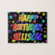 Este emocionante, divertido, diseño de rompecabezas con temática de cumpleaños tiene el mensaje "FELIZ CUMPLEAÑOS, ALLISON" con los personajes que tienen un coloreado patrón de gradiente inspirado en el espectro de arcoiris, además de un vibrante patrón de fondo de estrellas. Un rompecabezas colorido como este podría ser una manera divertida de enviar saludos de cumpleaños a alguien llamado Allison. [~Z0000468]