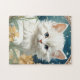 ¡Rompecabezas con gatito al estilo Art Nouveau de Alphonse Mucha! Un gatito blanco y mullido con ojos azules posa con flores amarillas. ¡Un regalo para los amantes del gato y de los coleccionistas Art Nouveau!