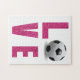 Diseño de palabras de Ama el fútbol con letras brillantes rosa intenso y la "o" es reemplazada por un balón de fútbol.