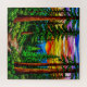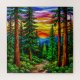 Arte colorido de vidrio teñido que presenta un paisaje forestal con árboles, amanecer vibrante y motivos de la naturaleza. Ideal para temas de arte, naturaleza y tranquilidad.