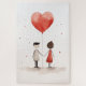 Un ilustracion minimalista y reconfortante de una pareja que se toma de la mano, conectado por un globo rojo con forma de corazón que flota sobre ellos. El diseño sencillo, la textura acuarela y los toques suaves de color sobre un fondo blanco le dan un toque suave y onírico a la obra de arte, simbolizando el amor y la unión de una manera pura e inocente.