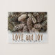Los festivos y rústicos conos de pino acentúan este diseño clásico y elegante que desea las vacaciones Amor y Alegría.