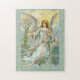 pintura vintage en pasteles con un ángel vestido de azul claro y sosteniendo flores.