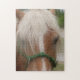 Cute cara de caballo con un rompecabezas de ganchillo por delante de Smilin' Eyes Treasures.