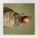 Un gato gracioso con una manzana balanceándose encima de su cabeza.