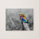 Hermosa ave de color arcoiris encaramada en un trozo. El fondo blanco y negro contrasta con las plumas de colores.