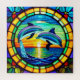 Coloridas obras de arte de vidrio manchado con dos delfines saltando en una vibrante puesta de sol en el océano, rodeadas de intrincados patrones de flores y formas geométricas, que encapsulan la belleza y la vida marina.