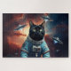 Una imagen cautivadora de un gato negro vestido de astronauta, mirando con confianza al cosmos. Rodeado de platillos voladores y una nebulosa vibrante, el gato encarna un sentido de aventura y misterio.