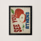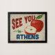 Un encantador rompecabezas de viaje vintage de Athens Georgia con una hermosa manzana roja, junto con un divertido texto de estilo retro que dice, "Nos vemos en Atenas"