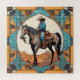 Retrato de una persona a caballo con un fondo desértico y un borde abstracto. Creado con la ayuda de IA a partir de un diseño original mío.