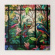 Este impresionante diseño de cristal teñido presenta pájaros coloridos encaramados entre plantas floridas.