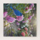 Un brillante azulejo posado en una peonía en un jardín exuberante lleno de flores coloridas, mientras la luz del sol fluía a través, realzando los colores vibrantes