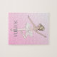 Un rompecabezas especial para la bailarina. El diseño se personaliza fácilmente introduciendo su propio nombre. Una bailarina de tubo rosa se despliega sobre un fondo rosado.