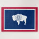 Este diseño presenta la bandera estatal de Wyoming, que es un estado doblemente mediterráneo en el oeste de Estados Unidos. Es el segundo estado más escasamente poblado del país. Wyoming está rodeada al norte por Montana, al este por Dakota del Sur y Nebraska, al sur por Colorado, al suroeste por Utah y al oeste por Idaho y Montana. El apodo oficial de Wyoming es "Estado de Igualdad", pero a veces también se le conoce como "Estado Cowboy" o "Gran Wyoming". La mitad occidental de Wyoming está cubierta en su mayor parte por los rangos de las Montañas Rocosas, mientras que la mitad oriental del estado es la pradera de alta elevación llamada las Llanuras Altas. El parque nacional Yellowstone se encuentra parcialmente en Wyoming y el parque nacional Grand Teton está completamente dentro del estado. Cheyenne es la capital del estado y la ciudad más poblada de Wyoming. La bandera del estado de Wyoming incluye una silueta de un bisonte americano. El rojo simboliza a los nativos estadounidenses y la sangre de los pioneros que dieron sus vidas. El blanco es un símbolo de pureza y rectitud. El azul es el color de los cielos y las montañas lejanas.