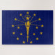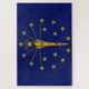 Este diseño presenta la bandera estatal de Indiana, que es un estado de los Estados Unidos en las regiones del Medio Oeste y los Grandes Lagos de Norteamérica. Limita con el lago Michigan al noroeste, Michigan al norte, Ohio al este, el río Ohio y Kentucky al sur y el sudeste, y el río Wabash e Illinois al oeste. Indiana fue admitida en Estados Unidos como el estado número 19 el 11 de diciembre de 1816. La bandera de Indiana fue diseñada por Paul Hadley y adoptada oficialmente por el estado de Indiana en 1917. La bandera consiste en una antorcha de oro que representa libertad e iluminación; los rayos alrededor de la antorcha representan su influencia de largo alcance. Las diecinueve estrellas representan el lugar de Indiana como el decimonoveno estado en unirse a Estados Unidos. Las trece estrellas del circuito exterior simbolizan las Trece Colonias originales, las cinco estrellas interiores representan los cinco próximos estados añadidos a la Unión, y la única gran estrella encima de la antorcha representa a Indiana. La ciudad capital de Indiana es Indianápolis, que es también la ciudad más grande del estado. Otras ciudades importantes de Indiana son Fort Wayne, Evansville, South Bend, Carmel, Fishers, Bloomington, Hammond, Gary, Lafayette, Muncie, Noblesville, Terre Haute, Greenwood, Kokomo, Anderson, Elkhart, Mishawaka y Lawrence.