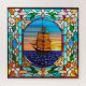 Una colorida pieza de arte de vidrio soplado que representa un majestuoso barco de vela contra una vibrante puesta de sol. Los intrincados patrones florales y geométricos enmarcan la pieza central náutica, combinando la habilidad artística con un tema marítimo.