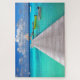 Rompecabezas con un embarcadero de madera y algunos barcos atados y una choza cubierta con paja en la laguna de las azules turquesas del tropical, de la isla del Pacífico Rangiroa, cerca de Tahití y de Bora Bora en Polinesia francesa.