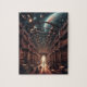 Un ilustracion de ensueño de una gran biblioteca flotando en el espacio, estanterías que se extienden hasta las estrellas, mezclando conocimiento con asombro.