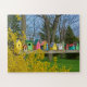 Este adorable rompecabezas de rompecabezas muestra una hilera de casas de pájaros coloridas disfrutando del sol de primavera. Un bosque amarillo, árboles, cielo azul y hierba verde rodean la hilera de casas de aves únicas.