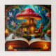 Una escena mágica con hadas en un bosque con una casa en forma de hongo, una cascada y una actuación musical que crea una atmósfera encantadora en medio de un entorno natural detallado.