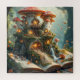 Una escena mágica con hadas en un bosque con una casa en forma de hongo, una cascada y una actuación musical que crea una atmósfera encantadora en medio de un entorno natural detallado.