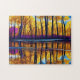 Esta imagen vívida captura la impresionante belleza de un bosque otoñal. Las hojas doradas brillan en los árboles, creando una escena cálida y acogedora. El suelo del bosque está lleno de tonos morados y azules, lo que añade profundidad y riqueza al paisaje. Un lago sereno refleja los árboles y el cielo, duplicando el festín visual de los colores. La calma del agua crea una sensación de tranquilidad que invita a sumergirse en el ambiente tranquilo del bosque otoñal.