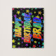 Este animado y vibrante diseño de rompecabezas con temática de cumpleaños presenta el mensaje "FELIZ CUMPLEAÑOS, BRAD" con los personajes que tienen un coloreado patrón de gradiente inspirado en el espectro de arcoiris, además de un divertido campo de patrones de fondo de estrellas. Un rompecabezas colorido como este podría ser una manera divertida de enviar deseos de cumpleaños a alguien llamado Brad. [~Z0000468]