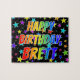 Este divertido y emocionante diseño de rompecabezas con temática de cumpleaños muestra el mensaje "FELIZ CUMPLEAÑOS, BRETT" con los personajes con un colorido patrón de gradiente inspirado en el espectro de arcoiris, junto con un dinámico patrón de fondo de campo de estrellas. Un rompecabezas vibrante como este podría ser usado para enviar deseos de cumpleaños a alguien llamado Brett. [~Z0000468]