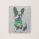 Un divertido y moderno animal de moda bulldog francés con una brillante proa de puntos polka verde y gafas. negro, gris imagen de perro cachorro, vintage, antiguo grunge gris angustiado fondo de papel, neón, verde vibrante, gris, negro, lindo, divertido, brillante, risible, a la moda . Perro, mascota, cachorro, raza de perro, animal, amante de los perros. Personalízalo con tu palabra o frase favorita de nombre haciendo clic en el botón personalizar y agregando texto, elige el tipo de letra y el color del texto. Impresión de imagen