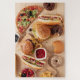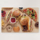 Este divertido rompecabezas de rompecabezas incluye una tabla rústica con hamburguesas, perritos calientes, pizza, papas fritas, donuts y más comida. hamburguesa, papas fritas, pizza, perro caliente, donuts, buñuelos, comida rápida, comida chatarra.