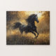 Un impresionante caballo negro corre con gracia a través de un pintoresco prado, iluminado por la luz dorada del sol, evocando libertad y vitalidad. Los árboles de los alrededores y las hojas dispersas realzan el ambiente mágico.