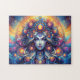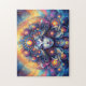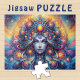 Relajante Puzzle - Retrato de ojos azules profundos de la cabeza de la diosa - Mes de las vibraciones de setiembre - Este hermoso estilo ai Design muestra la cabeza de una hermosa mujer con ojos azules profundos y color de piel azul claro. En su cabello hay joyas de disco decorativas redondas en su cabello flotante, habitando en un universo celestial divino. En el fondo hay un gran sol dorado. Los colores principales de esta obra de arte son el amarillo naranja dorado, el azul intenso cósmico.