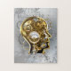 Cabeza conceptual, mecánica, humana con manómetro antiguo y engranajes metalizado sobre fondo industrial gris. Estilo Steampunk.