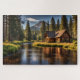 Una cabaña de verano rodeada de un pinar al lado de un río, con una montaña al fondo, crea un hermoso rompecabezas.