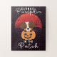 El pastor australiano se sienta en una calabaza. Los perros con espíritu de calabaza son animales dulces de Halloween. Calabazas con animales graciosos. Un disfraz perfecto para Halloween para cada amante de los perros.
