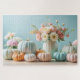 Esta hermosa composición presenta un tema de decoración de otoño suave y sereno, con calabazas de colores pastel en tonos blancos, azul claro, melocotón y naranja. Las calabazas están dispuestas de manera artística al lado de un impresionante ramo de flores pastel, con rosas, margaritas y otros suaves floreros, que se exhiben en un jarrón de cerámica de estilo vintage. La relajante paleta de colores pastel combinada con los elementos naturales crea un ambiente sofisticado y elegante.