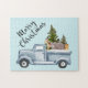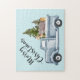 Un rompecabezas con un diseño festivo. Camión con Navidades de pinos junto con algunos animales de bosque. Un oso, un zorro y un ciervo parados en la parte de atrás yendo a dar un paseo. Diseño creado con acuarelas.