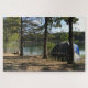 Este apacible paisaje se caracteriza por una carpa azul y gris en el bosque, a orillas de un gran lago. El agua estaba fría y el clima estaba caliente en ese brillante día de verano. Tomé esta foto mientras acampábamos en el Parque Estatal Table Rock en Branson, Misuri. ~ Copyright © Angela Ewing / My YARDVILLE.