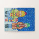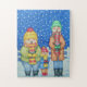 El original y gracioso ilustracion de Navidades en este jigsaw juvenil tiene tres lindos cantantes de villancicos cantando con entusiasmo una melodía festiva en la nieve de diciembre. La nieve está cayendo a su alrededor, pero están cálidamente envueltos en sus gorras de rayas de punto rojas y amarillas y rojas y verdes y pañuelos para mantener el frío del invierno afuera. Esta original imagen de Navidades humorísticos de los tres pequeños cantantes se ve muy estacional en este rompecabezas, los colores son agradables y brillantes para traer alegría festiva y una sonrisa a la cara de las personas especiales que la reciben como regalo de Navidades. ¡Feliz Navidad!