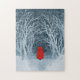 Pequeña Caperucita Roja en un invierno nevado caminando por el bosque. ¿Puedes ver al Gran Lobo Malo aullando a la distancia? Una versión borrosa de una pintura acuarela negativa.
