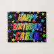 Este animado y vibrante diseño de rompecabezas con temática de cumpleaños muestra el mensaje "FELIZ CUMPLEAÑOS, CARLA" con los personajes que tienen un coloreado patrón de gradiente inspirado en el espectro de arcoiris, junto con un divertido patrón de fondo de estrellas. Un rompecabezas vibrante como este podría ser usado para enviar saludos de cumpleaños a alguien llamado Carla. [~Z0000468]