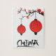 Cartel de China Lanterns Travel. Linternas de fuego en un cielo chino colgando de una rama de un árbol en flor.