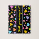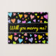 Este alegre, divertido y amoroso diseño de rompecabezas presenta un patrón de formas cardíacas de varios tamaños y colores variados. También presenta la pregunta de la propuesta de matrimonio "¿Te casarás conmigo?" en el frente en un texto similar a un guión amarillo. Un rompecabezas como este podría ser una manera divertida de entregar una propuesta de matrimonio a alguien especial.