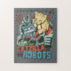 Impresionante diseño de un ilustracion tipo poster que presenta a un gato luchando con un robot y la cita "Catzilla contra los robots".