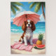 A charming Cavalier King Charles Spaniel relaxing under a beach umbrella with fresh summer fruits and ocean views. The soft colors and painterly style create a light and elegant coastal atmosphere.