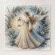 A luminous winter angel drifts through a quiet snowy landscape, carrying a softly glowing lantern that casts a warm golden halo against cool blue tones. Her flowing gown and feathered wings create an ethereal sense of grace, framed by evergreen branches, pale poinsettias, and delicate botanical details that enhance the peaceful Christmas atmosphere. The gentle contrast of warm light against frosted surroundings evokes hope, serenity, and sacred stillness, making this design ideal for holiday décor, spiritual themes, and winter storytelling. Elegant linework, soft watercolor shading, and a dreamlike palette blend together to create a timeless seasonal scene full of wonder and tender emotion. AI generated artwork.