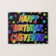 Este vibrante y divertido diseño de rompecabezas con temática de cumpleaños tiene el mensaje "FELIZ CUMPLEAÑOS, CHEYENNE" con los personajes con un coloreado patrón de gradiente inspirado en el espectro de arcoiris, además de un emocionante patrón de fondo de campo estrella. Un acertado rompecabezas como este podría ser una manera divertida de enviar saludos de cumpleaños a alguien llamado Cheyenne. [~Z0000468]