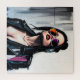 Una obra de arte audaz y elegante inspirada en el ciberpunk que presenta a una mujer segura de sí misma con una chaqueta de cuero, gafas de sol futuristas y audífonos. Ideal para los amantes de la moda urbana, el arte callejero y la estética futurista.