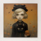 Retrato de una niña rara y espeluznante pero linda con un gato en su regazo. Ilustracion de Halloween